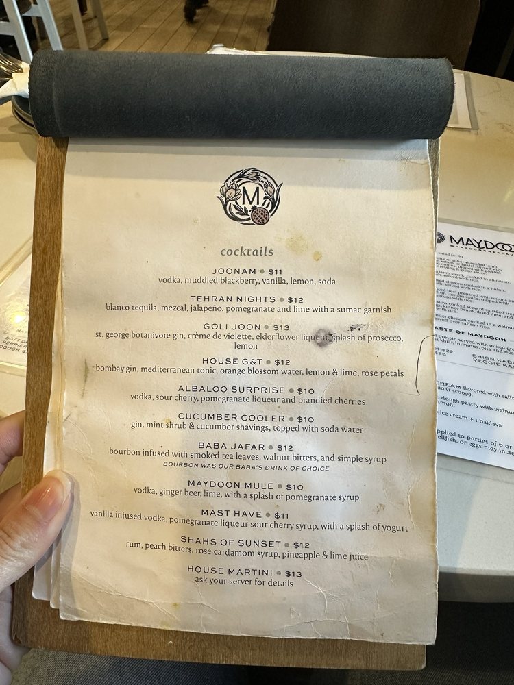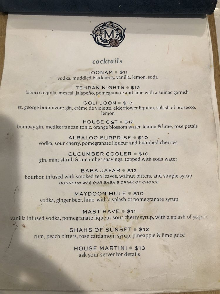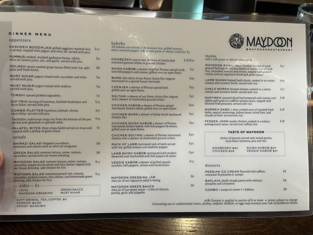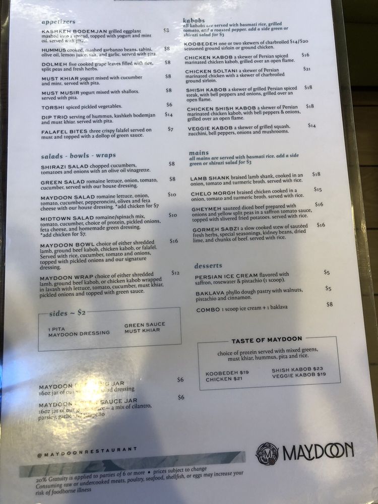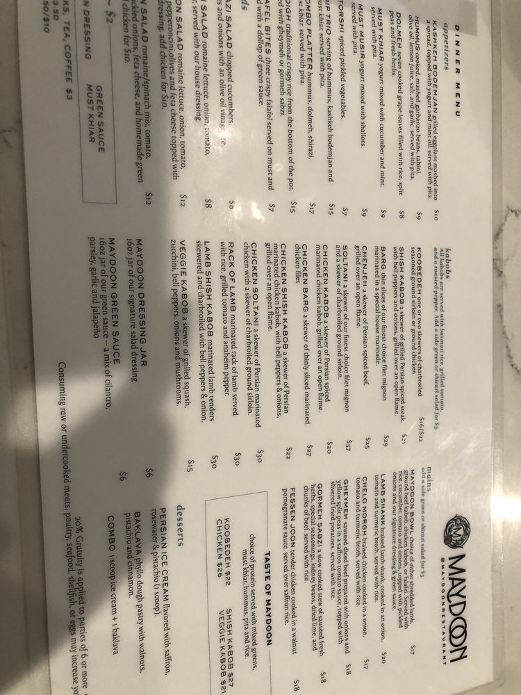 Maydoon, located at 1501 16th St Ste 111 in Sacramento, CA, offers a unique dining experience with its Persian cuisine. The restaurant provides a range of options for diners, including vegan and limited vegetarian choices. Customers praise the dip trio, featuring a variety of flavorful dips served with pita bread. The kabobs and lamb shank are highlighted for their tender and delicious qualities, although some found the chicken slightly dry. The family-style serving option allows for sharing plates of meat and rice. Friendly service and a clean, inviting atmosphere enhance the overall dining experience. Complement your meal with specialty drinks like Tehran Nights and indulge in traditional dishes like Cornish hen and rich stews. Maydoon stands out in the Sacramento area for its exceptional food, excellent service, and vegan-friendly offerings.