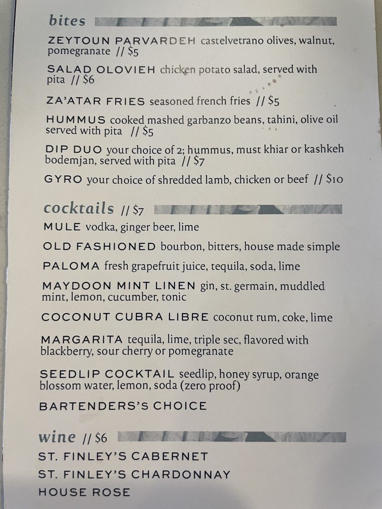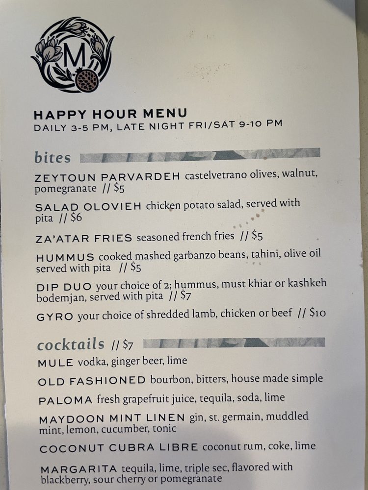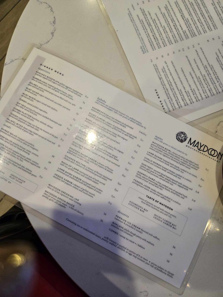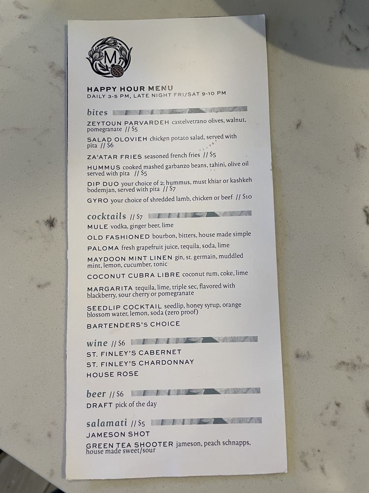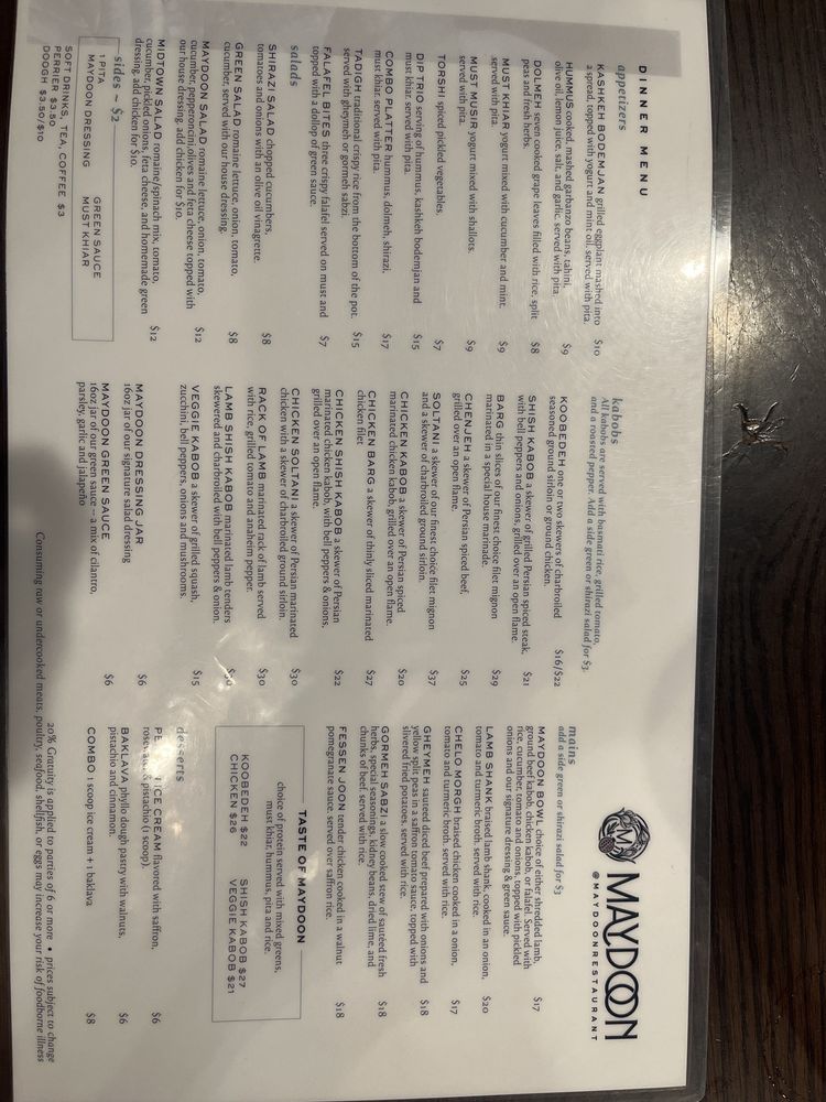 Maydoon, located at 1501 16th St Ste 111 in Sacramento, CA, offers a unique dining experience with its Persian cuisine. The restaurant provides a range of options for diners, including vegan and limited vegetarian choices. Customers praise the dip trio, featuring a variety of flavorful dips served with pita bread. The kabobs and lamb shank are highlighted for their tender and delicious qualities, although some found the chicken slightly dry. The family-style serving option allows for sharing plates of meat and rice. Friendly service and a clean, inviting atmosphere enhance the overall dining experience. Complement your meal with specialty drinks like Tehran Nights and indulge in traditional dishes like Cornish hen and rich stews. Maydoon stands out in the Sacramento area for its exceptional food, excellent service, and vegan-friendly offerings.